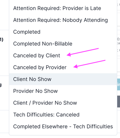 From the dropdown, select either "Canceled by Client" or "Canceled by Provider."
