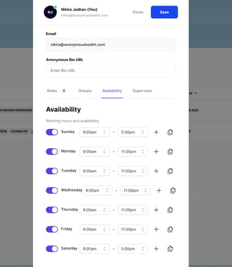 Toggle the days you are available (e.g., Monday, Tuesday).