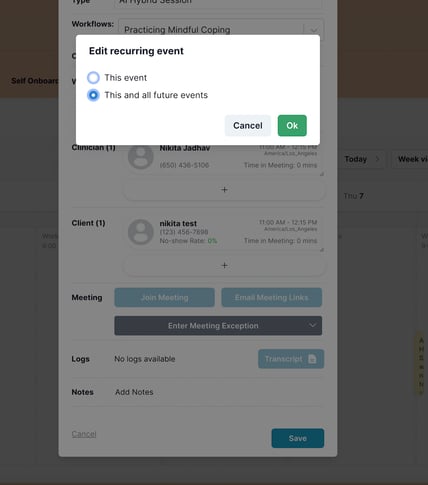 Choose the Appointment Series: A pop-up will appear. Select "This and all future events" if you want to reschedule every instance of this recurring appointment. To reschedule only this single appointment, select "This event."