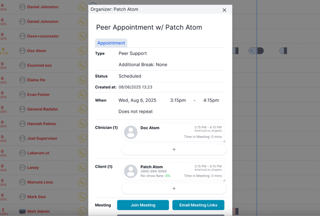 Click on any appointment block to see its details.