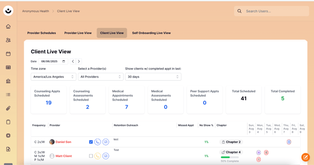 You can filter the schedules of clients by Providers, Time Zone, and Last completed Appointment.